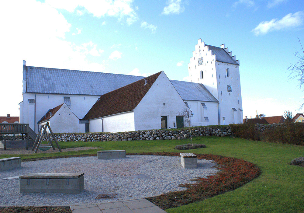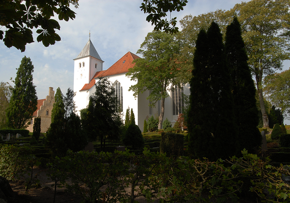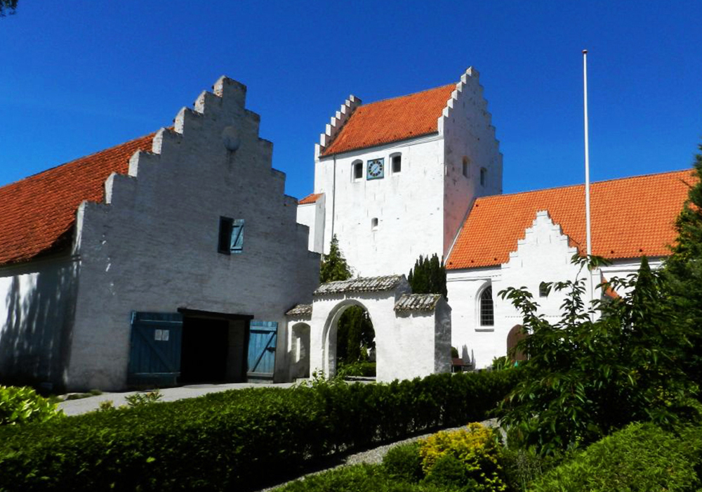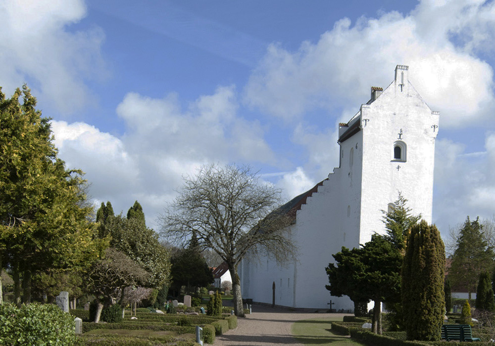 Den smukke gamle hvidkalkede kirke med sit vældige middelaldertårn ligger højt hævet på Tranebjerget i den nordligste udkant af sognet! Denne placering skyldes muligvis en tidligere tilknytning til Tranebjerggård, der kan have været Samsøs administrative centrum.